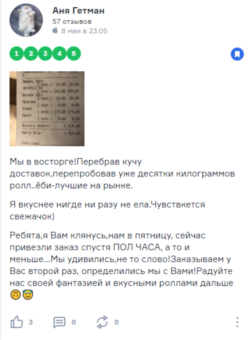 Соучредитель доставки, Константин Зимен, владелец рекламного агентства и один из лучших маркетологов в России. Все социальные сети ведем своими силами, настраиваем рекламу, разрабатываем всю полиграфию и др.
